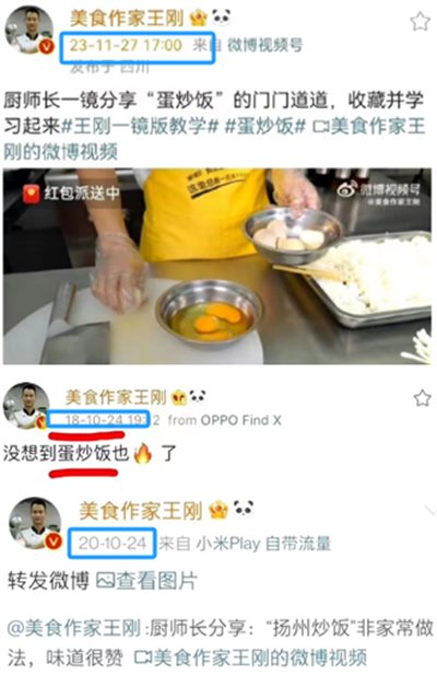 下午,有个叫@美食作家王刚 的美食博主在多个平台分享了“蛋炒饭”的视频,这本来没什么,但联想到此人在18年10月24日,20年10月24日两次分享过蛋炒饭的做法,连续在这样的日子发布蛋炒饭视频,这就很可疑了,到底是蛋炒饭的技术难度太大,需要反复出教程,还是故意恶心人的呢?