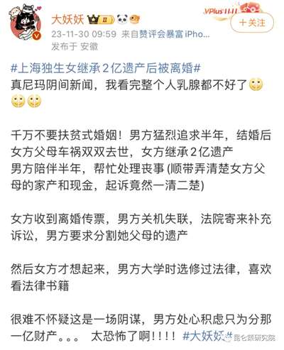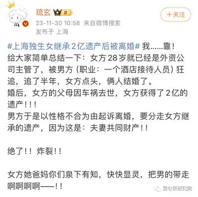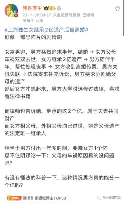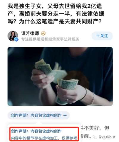 ●2022年3月10日律师谭芳编了个“穷小子疯狂追求富家独生女”“结婚后女方父母离世,留下2亿财产”“男方立刻要求离婚分财产”的故事发到了知乎上,当时文章最前面还有“内容包含虚构创作”的声明。