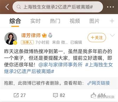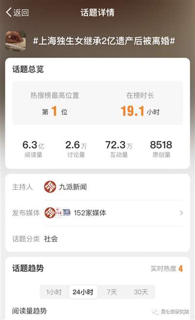 ●@九派新闻 制造的话题很快登顶热搜,150多家媒体跟进,总阅读量超过6亿。@上海法治报社 看到话题才想起来把报纸上的这篇旧文再发一遍蹭热点。