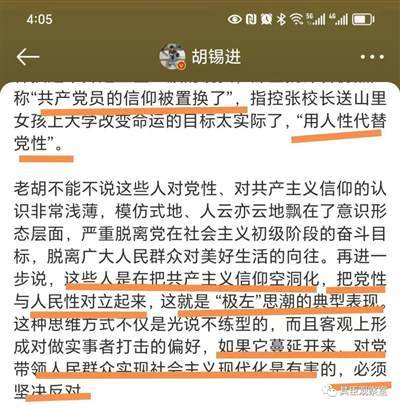 胡锡进妄言,左派“对党性、对共产主义信仰的认识非常浅薄,模仿式地、人云亦云地飘在了意识形态层面,严重脱离党在社会主义初级阶段的奋斗目标,脱离广大人民群众对美好生活的向往。”