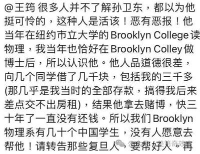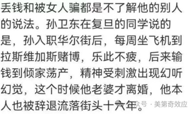孙卫东上学的时候就染上赌瘾,到处借同学的钱去赌,都是肉包子打狗有借无回。入职华尔街之后更是夸张到每周坐飞机去拉斯维加斯赌博,后来被华尔街辞退,输到倾家荡产,老婆无法忍受才离的婚。