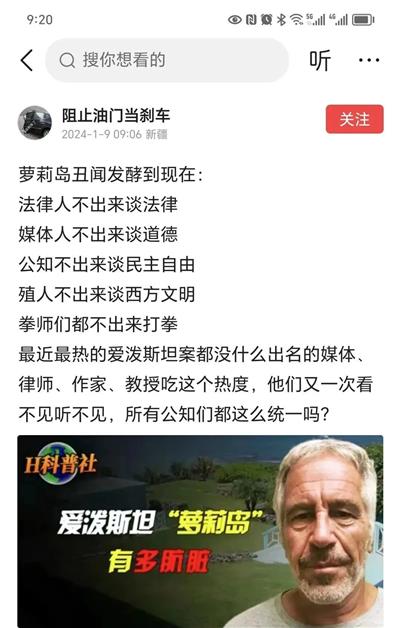 这对于中文互联网正在进行的舆论战影响极大,加速了中国意识形态反攻的进度。对爱泼斯坦事件的关注、挖掘和批判,和中国人从亚里士多德是否真实存在入手,对西方伪造历史展开质疑一起,从不同的两个方向,直接攻击到西方意识形态的心脏,能够迅速让对手从尚有进攻之力不得不直接转入全面的防守。
