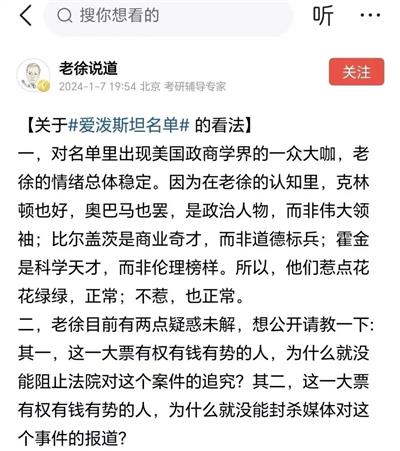 当然也有头铁的,以为自己巧舌如簧,就可以做到丧事喜办,把爱泼斯坦事件对美国体制光环的伤害性降到最低,比如这位叫老徐的,就给我们展示了一波洗地的新境界: