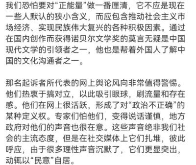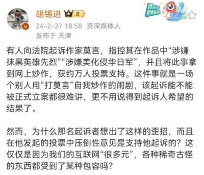 (一)正在实行犯罪或者在犯罪后即时被发觉的;”《宪法》规定了义务,《刑事诉讼法》则授予了每一个公民同犯罪分子作斗争的权利。可是,网络大V胡锡进第一个跳出来为危害意识形态安全的莫言辩护,给毛星火扣上一大堆帽子:“自我炒作的闹剧”、“民粹”、“扣帽子”、“断章取义”、“赚爱国流量”、“极左”、“闻阁”。经过胡锡进这一番吵闹,把很平常的一桩起诉搞成了热搜,导致整个网络撕裂。胡锡进支持莫言,我们没有意见。