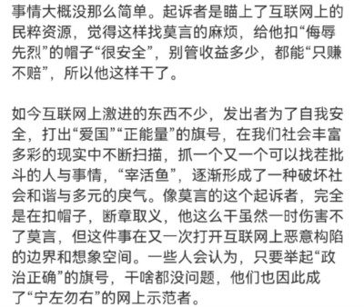 怎么起诉莫言就是反对改革开放了?是莫言领导了改革开放,还是莫言用污蔑八路军的文字指导了改革开放?前苏联之所以解体,俄罗斯与乌克兰至今还在刀兵相见,这与苏联公知诋毁、污蔑苏联英雄有着密切的关系。意识形态的混乱导致信仰的崩塌才是苏联解体的主要原因。莫言利用小说污蔑八路军与苏联公知污蔑卓亚、舒拉如出一辙,甚至有过之而无不及。