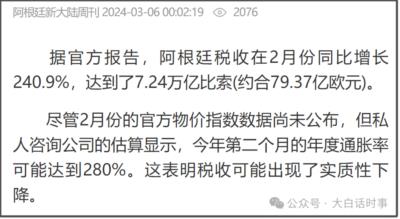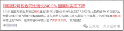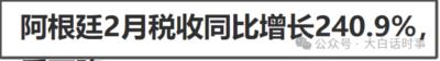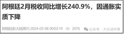 然后,我们看一下这个标题全貌《阿根廷2月税收同比增长240.9%,因通胀实质下降》。