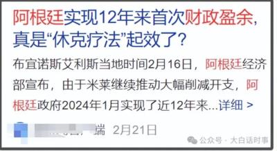 然后之前阿根廷1月实现财政盈余,更是被海量报道。就有这样的标题《阿根廷实现12年来首次财政盈余,真是“休克疗法”起效了?》
