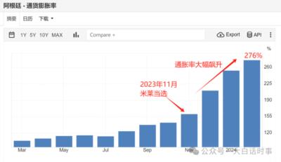 米莱去年11月当选时,阿根廷通胀率为160%,12月就飙升到211%,1月继续飙升到254%,2月持续上升到276%。