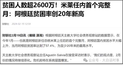 在米莱上任后,今年1月,阿根廷贫困人口大幅上升,贫困率达到57.4%,为20年来最高水平。