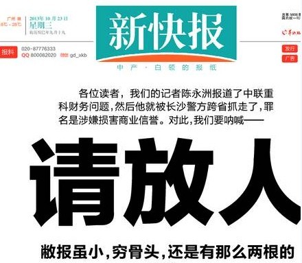 10月23日上午,早起的人们都被《新快报》的头版惊呆了:“请放人”三个黑体大字几乎占据了半个版面。那句“敝报虽小,穷骨头,还是有那么两根的”掷地有声,铿锵有力,让人想到为革命抛头颅洒热血的谭嗣同。新闻理想、言论自由、权力迫害、绝地抗争,网友们脑中瞬间飘过这几个让人激动的大词。“急公好义”如袁律师般的公知们以迅雷不及掩耳盗铃之速转发,然后声援,呼号,施压,大有一洗记者陈宝成乌龙案屈辱的势头。
