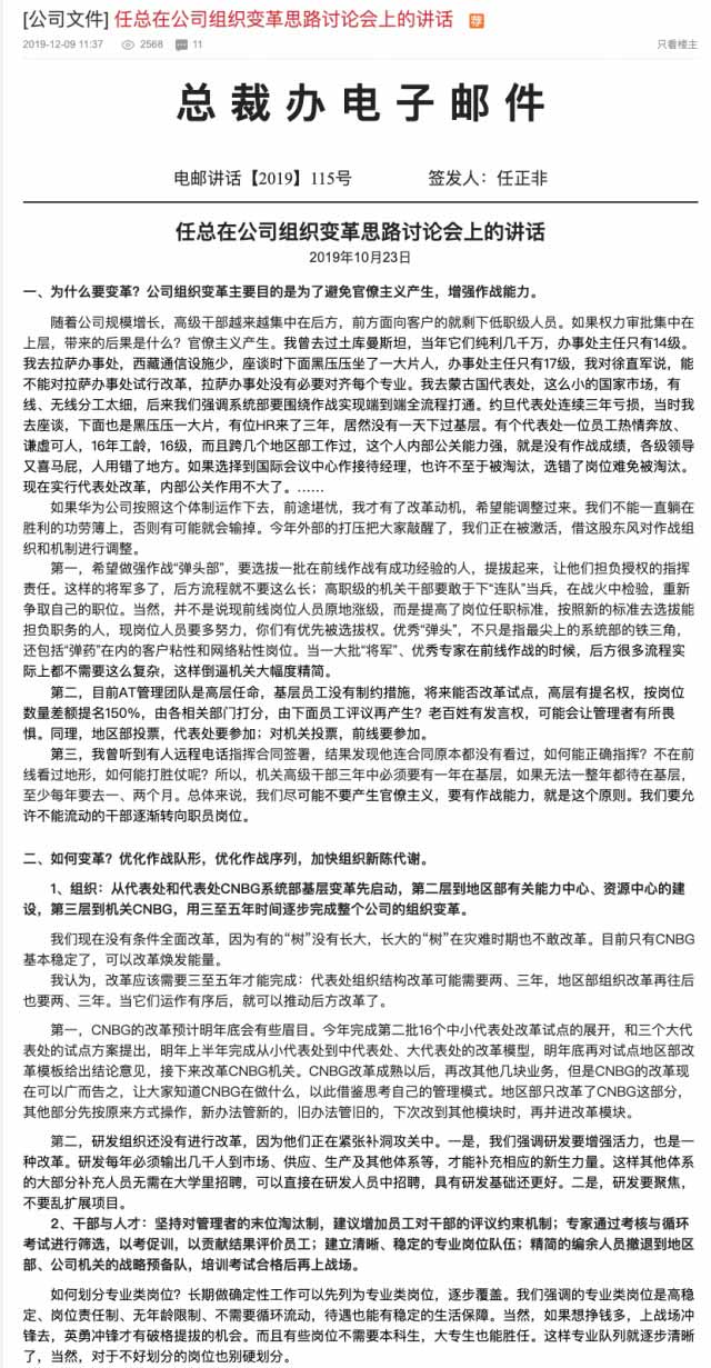 从任总的讲话里也能看出他的改革思路,无非就是两点,一是“机关干部沉下去”,二是精简机构业务。这并没有什么稀罕的,从21世纪以后全世界所有在改革的军队,都是这两个改革思路。讲企业管理我不如任总,讲带队冲锋任总不如我,让大头兵去冲锋之前,有些事情你要先解决好,没解决好就让人抱起步枪去冲锋,很容易把队伍搞哗变,希望任总体察: