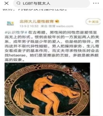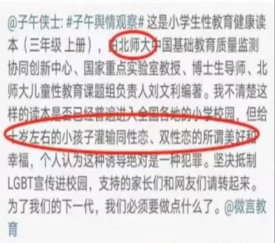 人教版教材事件发酵后,人们陆续发现,崇洋媚外的流毒,早已经全方位渗透进孩子们学习的教材中。如果说人教版只是在丑化国人形象,用奇葩的形象设计博出位,侮辱中华民族。而北师大主编并出版的性教育读本,则是对中国下一代进行赤裸裸的LGBT教唆,试图阉割中华文华,阻断中国儿童对中华文明传统价值观的认同感。