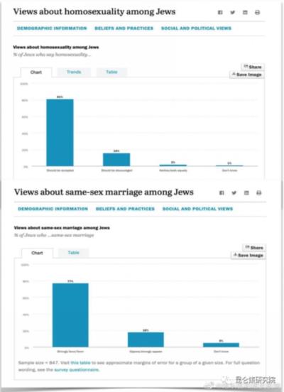 据权威机构皮尤Pew Research统计,美国犹太人对同性恋的支持率高达81%,反对的仅为16%。而支持同性恋婚姻的犹太人的高达77%,反对仅为18% 。