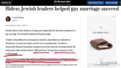 拜登认为,同性恋婚姻的通过,犹太人的贡献达85%,要知道,犹太人口在美国仅占2%,但是他们对推动同性恋婚姻的贡献却是85%。这正常吗?