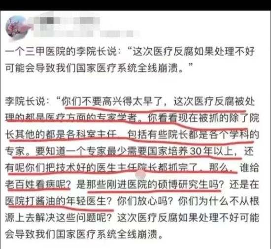 "你们不要高兴得太早,这次医疗反腐被处理的都是医疗方面的专家学者,你看看现在被抓的除了院长其他的都是各科室主任,包括有些院长都是各个学科的专家。要知道一个专家至少需要国家培养30年以上。还有你们把技术好的医生主任院长都抓完了,那么,谁给老百姓看病呢?是那些刚进医院的硕博研究生吗?还是在医院打酱油的年轻医生?你们放心吗?你们为什么不从根源上去解决这些问题呢?这次医疗反腐如果处理不好,可能会导致我们国家医疗系统全线崩溃。"