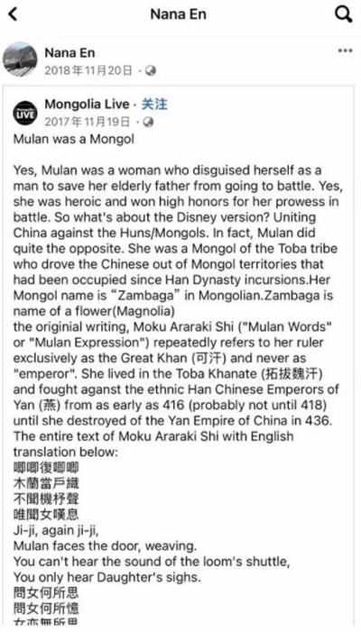 该内容为娜然转发,其中写到:花木兰是拓拔部落的蒙古人,蒙古名为赞巴加花木兰,并非如迪士尼版《花木兰》电影里那样,是与中国汉人一起,抵抗匈奴/蒙古人的入侵;而是恰恰相反,她要把中国人赶出汉朝以来侵占的蒙古土地。