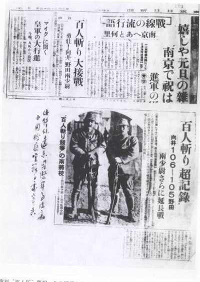 1937年12月13日,《东京日日新闻》报道两名日本军官的“杀人竞赛”。日军第十六师团中岛部队两个少尉军官向井敏明和野田毅在其长官鼓励下,彼此相约“杀人竞赛”,商定在占领南京时,谁先杀满100人为胜者。他们从句容杀到汤山,向井敏明杀了89人,野田毅杀了78人,因皆未满100,“竞赛”继续进行。12月10日中午,两人在紫金山下相遇,彼此军刀已砍缺了口。野田谓杀了105人,向井谓杀了106人。又因确定不了是谁先达到杀100人之数,决定这次比赛不分胜负,重新比赛谁杀满150名中国人。这些暴行都一直在报纸上图文并茂连载,被称为“皇军的英雄”。日本投降后,这两个战犯终以在作战期间,共同连续屠杀俘虏及非战中人员“实为人类蟊贼,文明公敌”的罪名在南京执行枪决。
