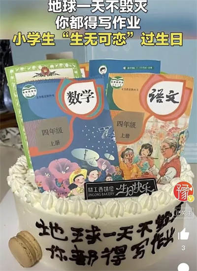 还有家长分享给孩子的生日礼物,是插着教辅书籍的蛋糕,回想我们那个年代,小学基本是不需要教辅的。