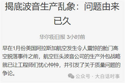 按照《华尔街日报》的这个报道,意思是有问题的只是因为波音把这些零部件交给了不靠谱的外包商,有问题的是这些外包生产商,而不是波音制造本身没问题,波音自己生产的零部件还是靠谱的,言下之意就是美国高端制造业仍然可靠。