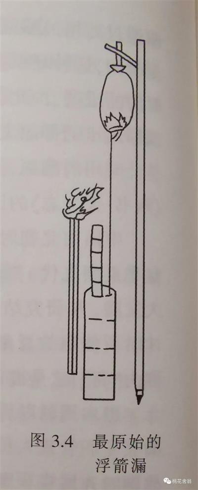 淹箭漏刻又发展成浮箭漏刻:另设一壶收集漏壶所排出的水,在这个壶中放一木块,将箭插在木块上,随着壶中水位的上升,箭露出壶外的部分也逐渐增加,这样,通过观察箭露出壶外的长度,就可以直观显示时间流逝的长短。宋代杨甲编著的《六经图》记载了浮箭漏刻最原始的形式(见下图),图中左侧的火炬是在冬天为防止漏壶中的水结冰而采取的防护措施。浮箭漏产生的时间大致是在汉武帝时期。这个时期也开始把漏刻作为天文报时仪器,《后汉书·律历志》曾经写道:“孔壶为漏,浮箭为刻,下漏数刻,以考中星,昏明生焉。”所说的就是浮箭漏刻在天文工作中的应用。