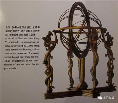 西汉时,张衡设计制造了“水运浑象”。据《晋书·天文志》记载:“至顺帝时,张衡又制浑象,具内外规、南北极、黄赤道,列二十四气、二十八宿、中外星官及日月五纬,以漏水转之于殿上,室内星中出没与天相应。因其关戾,又转瑞轮蓂荚于阶下,随月虚盈,依历开落。”这就是天文学史上有名的张衡水运浑象。