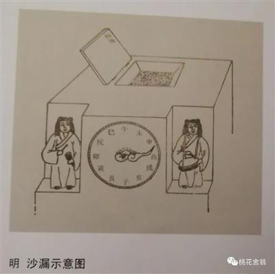 在前代机械装置的基础上,明代出现了沙漏报时仪器。据《明史》记载:“明初,詹希元以水漏至严寒水冻辄不能行,故以沙代水。”沙漏是由沙池、斗轮(初轮)、减速齿轮和时刻显示四部分组成。沙池底部有一个小孔,用来贮放和漏出细沙。斗轮的周围均匀地分布着十六个沙斗,当沙池中漏出的细沙注入其中一个沙斗时,便会导致斗轮重心倾斜而转动,从而带动四对分别为六齿和三十六齿组成的减速齿轮组,第四个齿轮(中轮)的轴则穿出一只盘面刻有十二时辰和昼夜百刻标志的报时盘盘心,立轴上端装有指针,沙漏运行时,指针也就相对于报时盘而旋转。从沙池漏出的沙流推动斗轮经过齿轮减速组,使最后一只齿轮带动的指针在一天中恰好旋转一周。沙漏的轮与沙池皆藏在机腹,唯盘露出机面,两旁各立一黄衣童子,一击鼓,一鸣钲。这个沙漏除了动力系统外的大部分,已经与现代机械钟基本一致了。