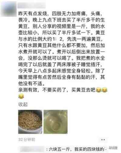 干黄豆煮水喝,能退高烧。每个人的量:二两干黄豆,三碗水熬成一碗水,喝汤,不吃豆(不好消化)。