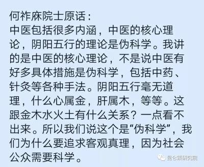 问题是,你何老先生想过没有?任何中成药说明书上全都没有阴阳五行一个字,难道它们就不是中药了吗?难道它们都没有按照中医的基础理论阴阳五行的指导下配药吗?这点常识就连三岁小孩都能明白吧?谁看到过医生处方时还写上阴阳五行?有必要向患者推送中医基础理论知识吗?