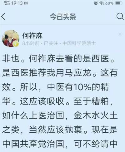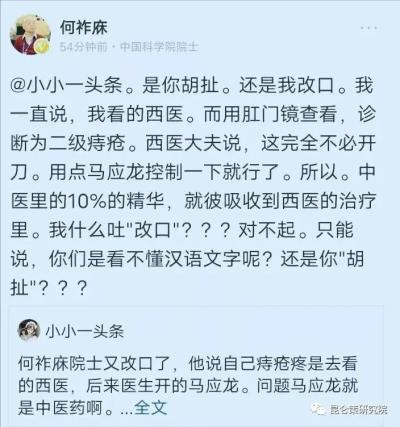 何祚庥院士诡辩的功夫绝对是一流的,即使他亲身体会到中药的疗效,他也不会感恩戴德,这一点也同样体现在他在患病期间对待司马南呼吁有关方面对他的照顾的问题上。