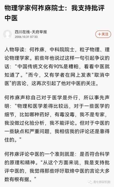 评论中医的一个准则就是:是否符合科学的原理和精神。“从这个方面来说,我是支持批评中医的,我觉得那些呼吁取缔中医的言论大多数有根有据。”