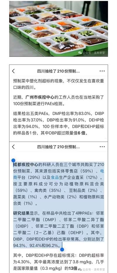 成都市疾病预防控制中心发表在《食品安全质量检测学报》的研究结果令人震惊:在抽检的210份预制菜中,DIBP、DBP和DEHP三种塑化剂的检出率分别高达94.3%、92.4%和96.2%。