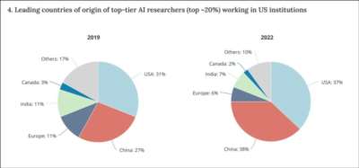 如果华盛顿切断与外籍科学家的联系或迫使他们离境,后果将极为严重。美国在人工智能领域之所以领先,正是因为吸引了来自全球的顶尖专家。乔治城大学的一项研究显示,2010至2021年间,美国顶尖AI研究人员中有70% 出生在海外,《福布斯》数据显示,美国领先AI企业中有65%至少有一位移民联合创始人。
