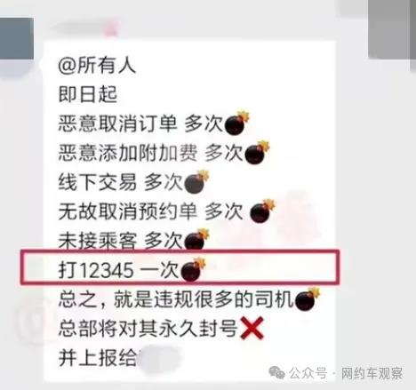 投诉平台就封号,似乎成为小平台们不成文的规定。今年上半年,还有平台司管光明正大的发出通知,网约车司机取消订单、添加附加费、线下交易、无故取消预约单、未接乘客等行为,违规多次的将被永久封号。而只要拨打一次12345,同样也会被封号。