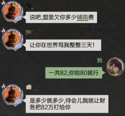 盟里拖欠80块铺路费,最后还得金主亲自出面解决,那这可就是天大的事情了,因为这涉及到面子问题。