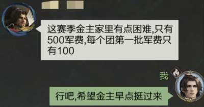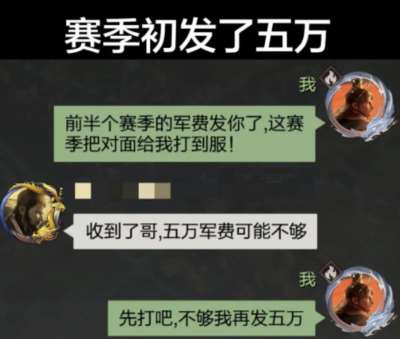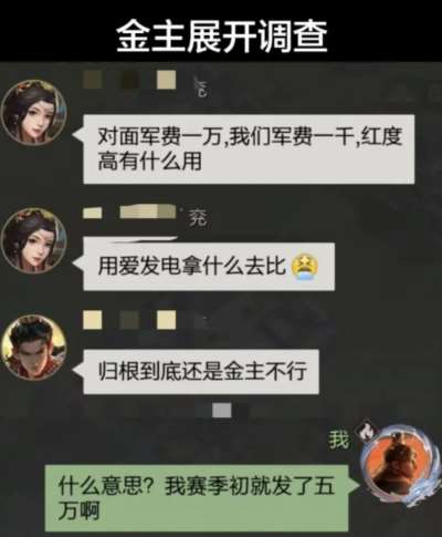 涉事赛季,盟里金主给的初始军费是5万元,盟主对金主说不够,金主回复先打,后面再给5万。