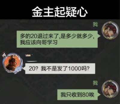 然后这个金主做了两件事,第一件事就是给相关二创视频投了点流,给了一个初始助推力,花小钱办了大事,把这事给弄火了,狠狠的恶心了80哥一把。第二件事就是把被拖欠铺路费的游戏民工们都找到了,每个人都发了100块,然后把80哥的账号告诉他们了,让他们去加80哥然后退费20元。