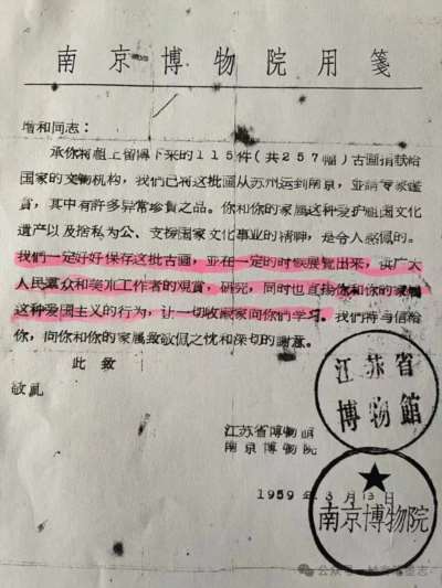 南京博物院1959年3月13日接受捐赠致谢庞家后人的信,白纸黑字写着:“我们一定好好保存这批古画”