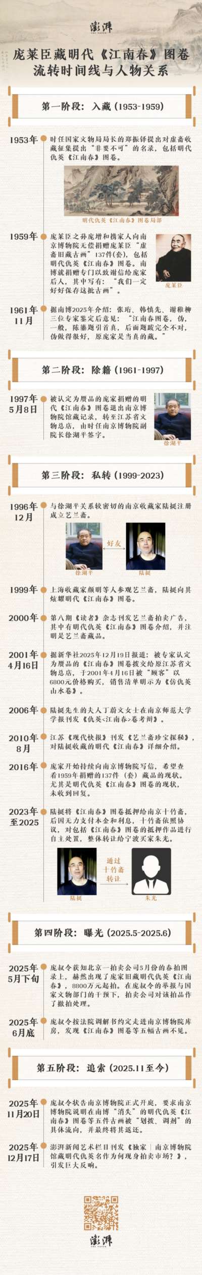 由于此前公开的报道都集中于南博旧藏仇英《江南春》图卷由陆挺收藏,2025年5月,陆挺因病去世,《江南春》图卷其后现身拍卖市场,很多人以为是陆挺家属送上拍卖市场,然而据庞叔令对澎湃新闻表示,她在今年11月20日的法庭审理阶段得知,此画并非由陆挺家属上拍,而是由一位宁波人朱光送拍。
