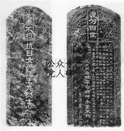 1985年,父老乡亲为王光重修烈士墓,在墓前竖起了塑像和纪念碑。纪念碑正面镌刻文字如下: