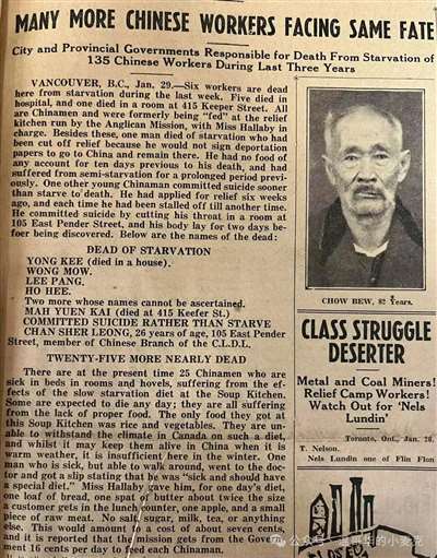 之所以有125名华人先侨成为加共华人支部的第一批党员,缘于大萧条期间发生在温哥华的一起惨绝人寰悲剧。原来大萧条爆发后,由于排华政策没有废除,导致失业华人劳工无法领取政府救济,三年时间竟有135人活活饿死,当中年纪最大的为82岁。只有加共和平民合作联盟(加拿大新民主党前身)为华人发声,通过教会向饥饿华工提供紧急援助,从而赢得了华工的民心。