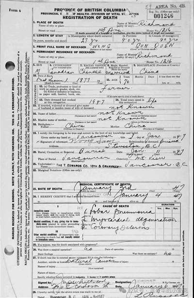 从死亡证明来看,黄自生来到加拿大已有40年,即1907年登陆,而在列治文居住了27年,即1920年搬到列治文居住。通过这两个重要的时间点,加之旁证史料辅助,就不难理解为何黄自生从清朝遗民成长为共产党员。