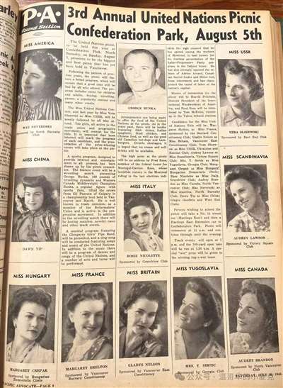 值得一提的是,前面提到的Nora Low 是加共华人支部的女性成员,而除了她以外,当时支部还有其她女性,是唐人街社区最早呼吁女性和男性权益平等的。1943年为庆祝《联合国家宣言》签署一周年,加共举办了首届联合国家庆典暨选美比赛,胜出者为华人支部女性成员,中国小姐Ann Lew ,她将自己的奖金全部捐出,用于资助女性华裔求学深造和替女性华工维权,1945年第三届比赛参赛的中国小姐为华人支部成员,唐人街首富叶春田的孙女Dawn Yip,而她参赛的目的是为了在华人社区宣传女性权益,当届胜出的是法国小姐Margaret Shelton,日后她成为了教师,还负责过加共党报《人民之声》的发行工作,一直活跃在温哥华女权保障第一线。