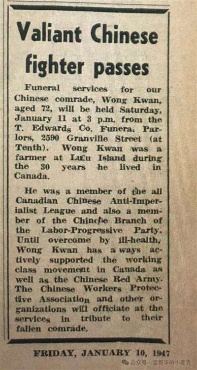 Wong Kwan是全加华人反帝同盟的成员,也是劳工进步党华人支部的一份子。Wong Kwan一直积极投身于加拿大的工人阶级运动和支援中国红军,直到病重。葬礼将由华工保障协会和其他组织共同主持,以向逝去的同志致敬。