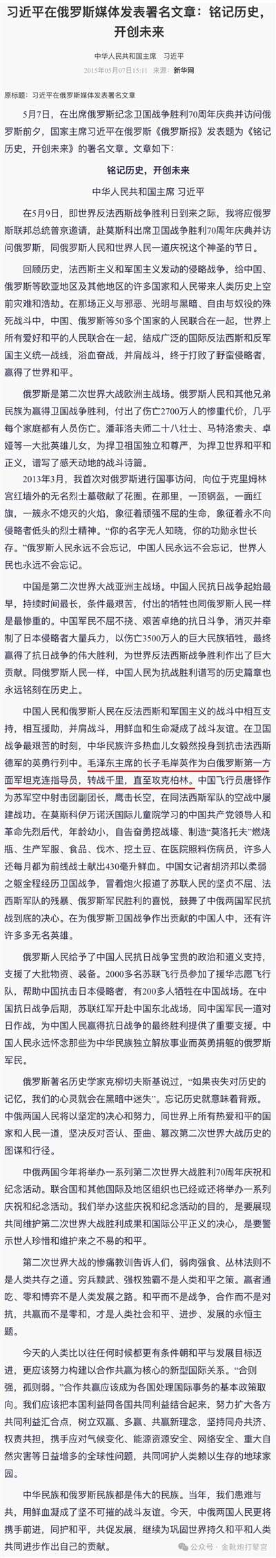 2015年5月7日,领袖在参加俄罗斯卫国战争胜利七十周年活动时,在俄罗斯《俄罗斯报》发表题为《铭记历史,开创未来》的署名文章,文中指出: