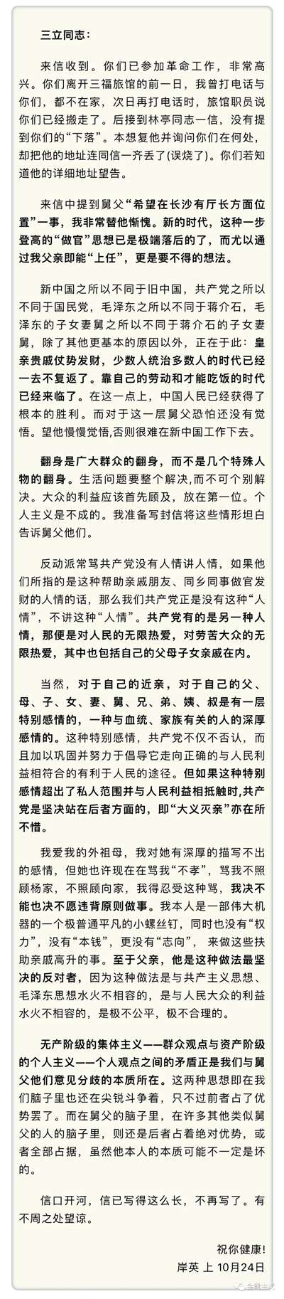 不妨就以岸英在建国后给表舅向三立的一篇回信做例——就我个人而言,真心呼吁岸英同志的这篇回信收录进校园的教科书,以及各级党校的必备教材: