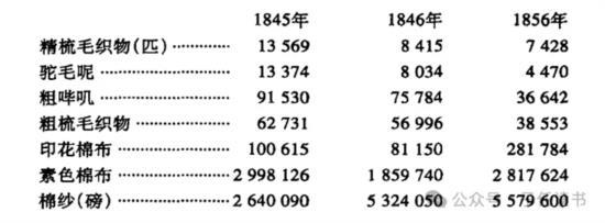 他举出的造成这次大失败的第一个重要原因是:在璞鼎查签订条约以后的最初三年中,中国市场被盲目过量涌进的商品所充斥,英国商人不注意中国人需求什么。英国对中国的出口额在1836年是1326388英镑,在1842年下降到969000英镑。此后四年中又连续迅速增长,从下列数字可以看出: