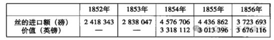 但是,所有这一切论据和例证,除了说明1843-1845年贸易过热所引起的反应以外,不能说明任何问题。贸易骤增之后又出现剧烈的缩减,一个新的市场从一开始就为过剩的英国商品所窒息,人们把商品投入这个市场而没有很好地估计消费者的实际需要和支付能力,这些现象决不是对华贸易所特有的。实际上,这是世界市场历史上经常有的现象。拿破仑垮台以后,欧洲大陆开放通商,那时英国的出口同大陆的购买能力很不相称,以致“由战争转向和平”倒比大陆封锁[大陆体系或大陆封锁是法国皇帝拿破仑第一在拿破仑战争期间为反对英国而采取的一项重要的经济政治措施。1805年法国舰队被英国舰队消灭后,拿破仑于1806年11月21日颁布了《柏林敕令》,禁止欧洲大陆各国同英国进行贸易。参加大陆体系的有西班牙、那不勒斯、荷兰、普鲁士、丹麦和奥地利。根据1807年的蒂尔西特条约的秘密条款,俄国加入了大陆体系。1812年拿破仑在俄国遭到失败后,所谓的大陆体系便瓦解了。——编者注]更具有灾难性。坎宁对美洲的西班牙殖民地独立的承认,也促进了1825年商业危机的发生。为适应莫斯科的气候而制造的商品,当时被运往墨西哥和哥伦比亚。再说,今天甚至连澳大利亚,尽管它具有很大的伸缩性,也没有摆脱一切新市场所共有的命运——市场上的商品既超过了它的支付能力也超过了它的消费能力。中国市场所特有的现象是:自从1842年的条约使它开放以来,中国出产的茶叶和丝向英国的出口一直不断增长,而英国工业品输入中国的数额,整个说来却停滞不变。中国方面的这种持续增长的贸易顺差,可以说同俄国和英国之间贸易差额的状况相似;不过后一种情况,一切都可以用俄国的保护关税政策来解释,可是中国的进口税却比任何一个同英国通商的国家都低。1842年以前,中国对英国的出口总值约为700万英镑,1856年约达到950万英镑。输入英国的茶叶数量,在1842年以前从未超过5000万磅,而在1856年就增加到约9000万磅。另一方面,英国进口的中国丝,只是从1852年起才占有重要地位。其增长情况,可以从下列数字中看出: