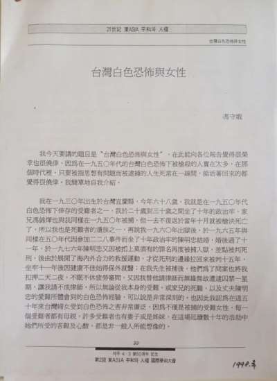 冯守娥1998年出席“21世纪东亚和平与人权国际会议(纪念济州岛四三事件五十周年)”的演讲文稿。图片为陈志平提供