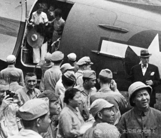 毛主席一行是10月11日从重庆九龙坡机场登机飞回革命圣地延安的。下面这张照片就是定格毛主席回到延安下飞机的历史瞬间。