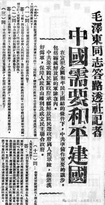 在飞机上,蒋介石看到了当日《新华日报》上刊登的毛主席回答路透社记者提问的报道。毛主席说:“中共现有一百二十万党员,在它领导下获得民主生活的人民现已远超过一万万。这些人民,按照自愿的原则,组织了现在数达一百二十万人以上的军队和二百二十万人以上的民兵,他们除分布于华北各省与西北的陕甘宁边区外,还分布于江苏、安徽、浙江、福建、河南、湖北、湖南、广东各省。中共的党员,则分布于全国各省。”